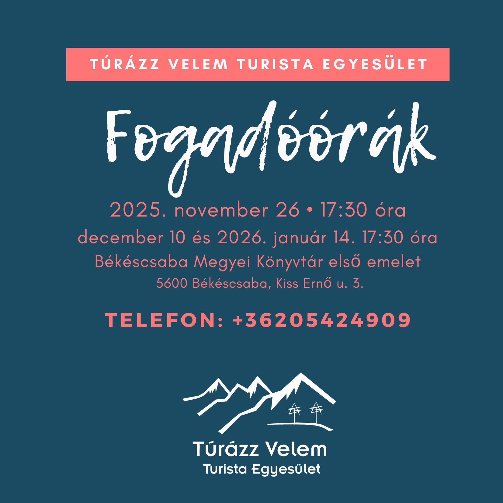 2025. december 10-én szerdán, 2026. január 14-én szerdán 17:30 óráról 18:30 óráig egyesületi fogadóórát tartunk a Békés Megyei Könyvtár 1. emeletén. Egyesületi tagnak lehet jelentkezni, tagdíjakat és részvételi díjakat készpénzben lehet fizetni, túrajelentéseket le lehet adni. Információs telefon +36205424909